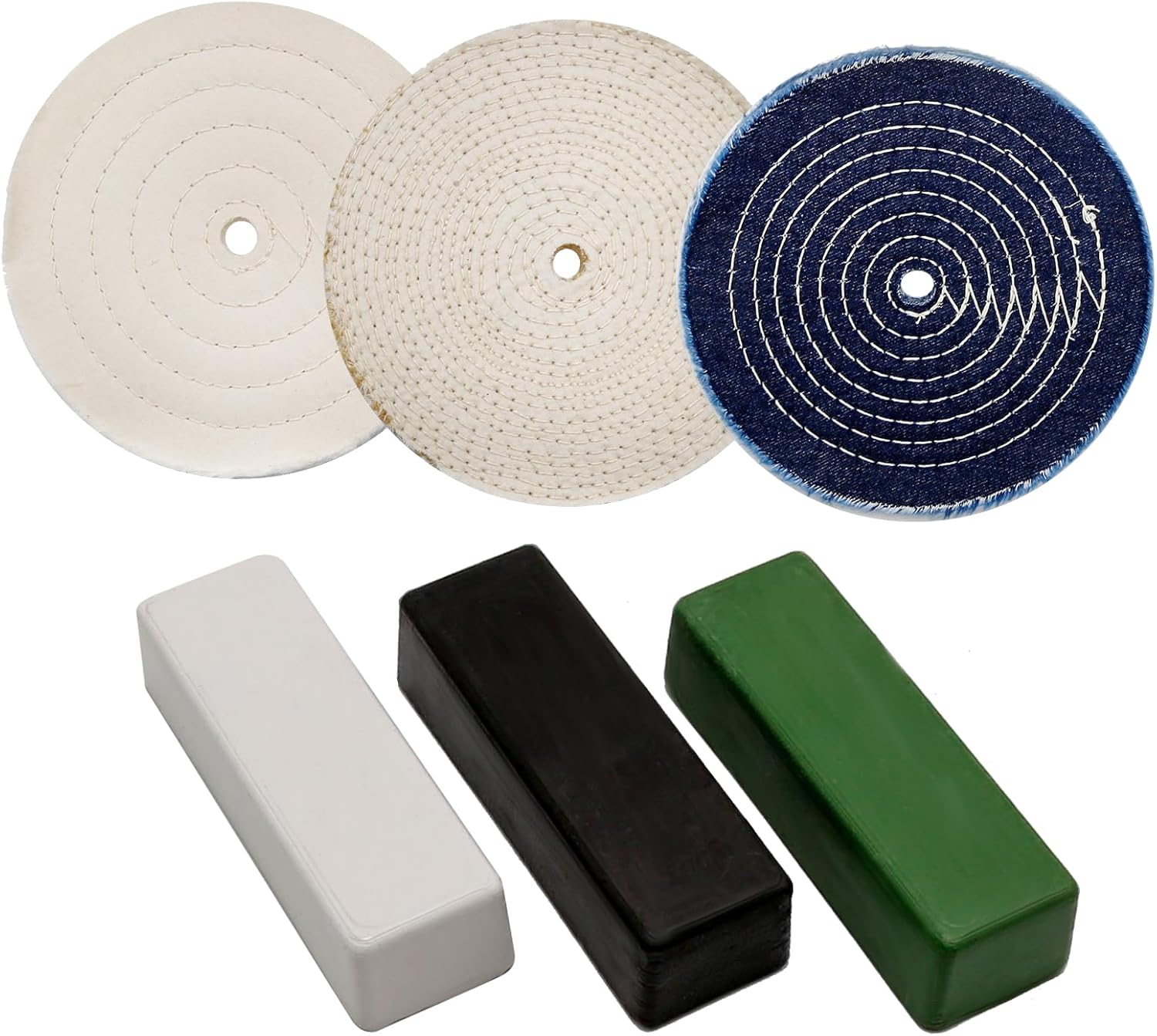 3-Step 8" Stainless Steel Polishing Kit:For stainless steel polishing on an 8" bench grinder.KIT INCLUDES3 stainless steel polishing wheels (sisal/denim/cotton)3 stainless steel polishing compounds (black/green/white)Polishing wheel kit dimensions and details:All polishing wheels have a 5/8" bore and are 1/2" thick.1PC 8" sisal polishing wheel made of fine sisal and cotton cloth, spiral stitched, with 100 grams of black polish for first stage polishing.1PC 8" Denim Polishing Pad, made of denim cloth, sewn concentrically, with 100 grams of green polish, for intermediate stage polishing.1PC 8" cotton polishing wheel, made of fine cotton cloth, sewn concentrically, soft, with 100 grams of white polish 1 for the final stage of polishing.Stainless steel polishing in 3 steps effect:Step 1: Polishing marks and scratches on stainless steel products.Step 2: Polishing the dull surface left in step 1.Step 3: Perform the final high polish.