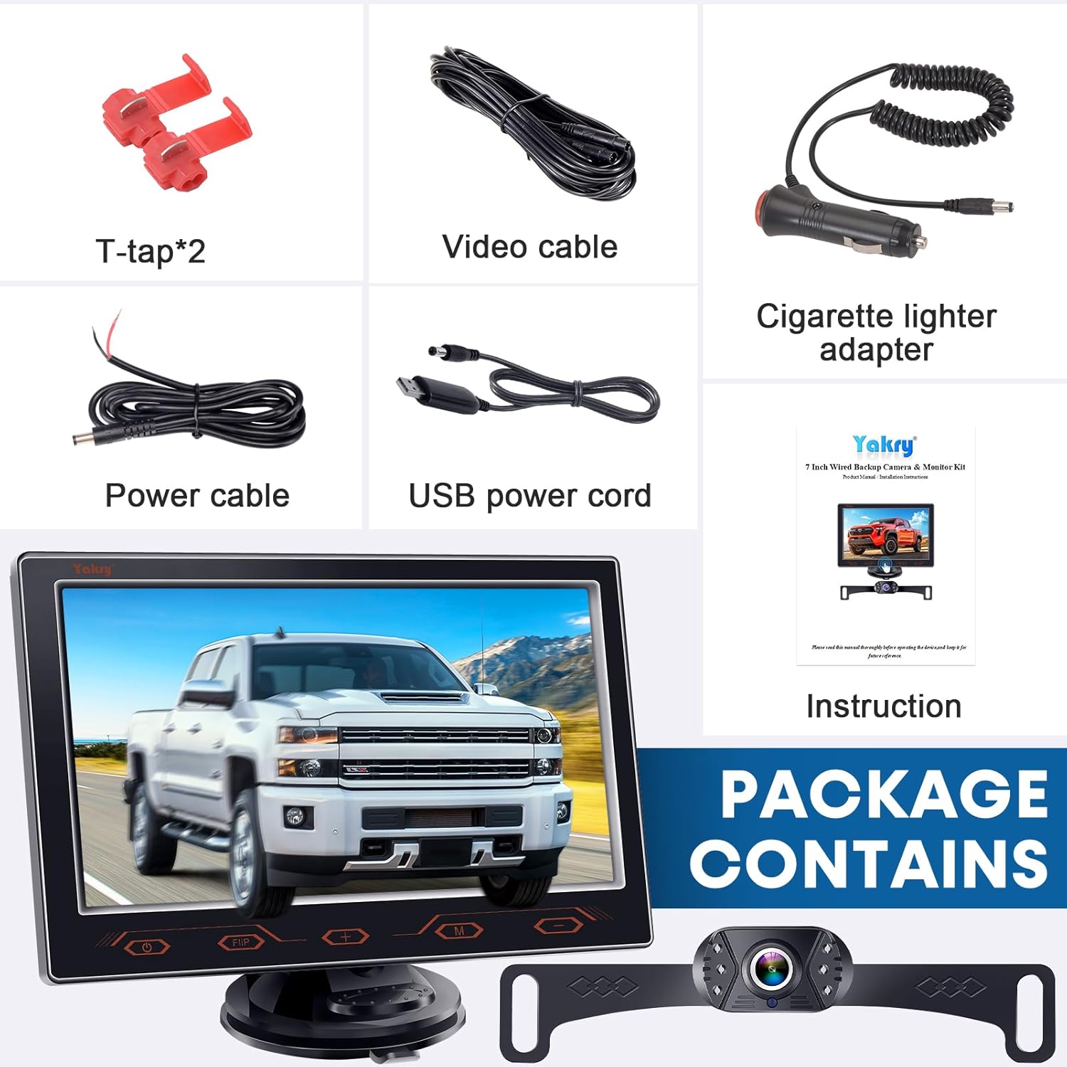 | BuiltIn Media | 1 * 7 Inch Monitor, 1 * Cigarette lighter adapter, 1 * Suction cup mount, 1* Backup camera, 3 * Power cables |