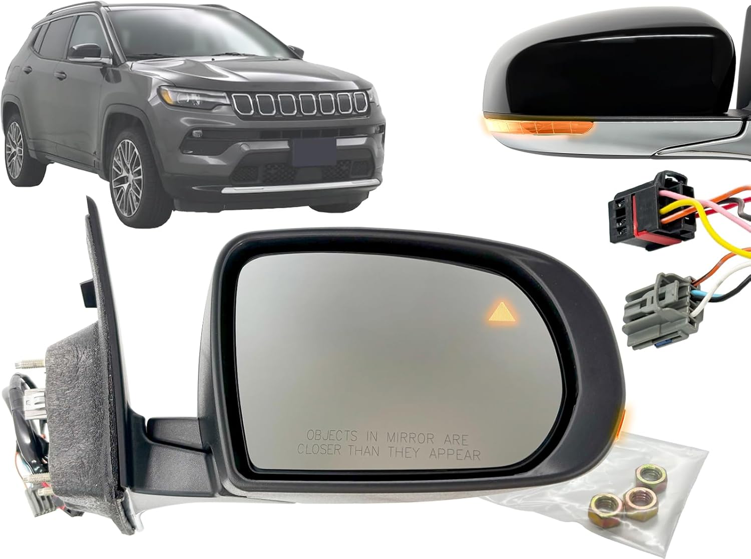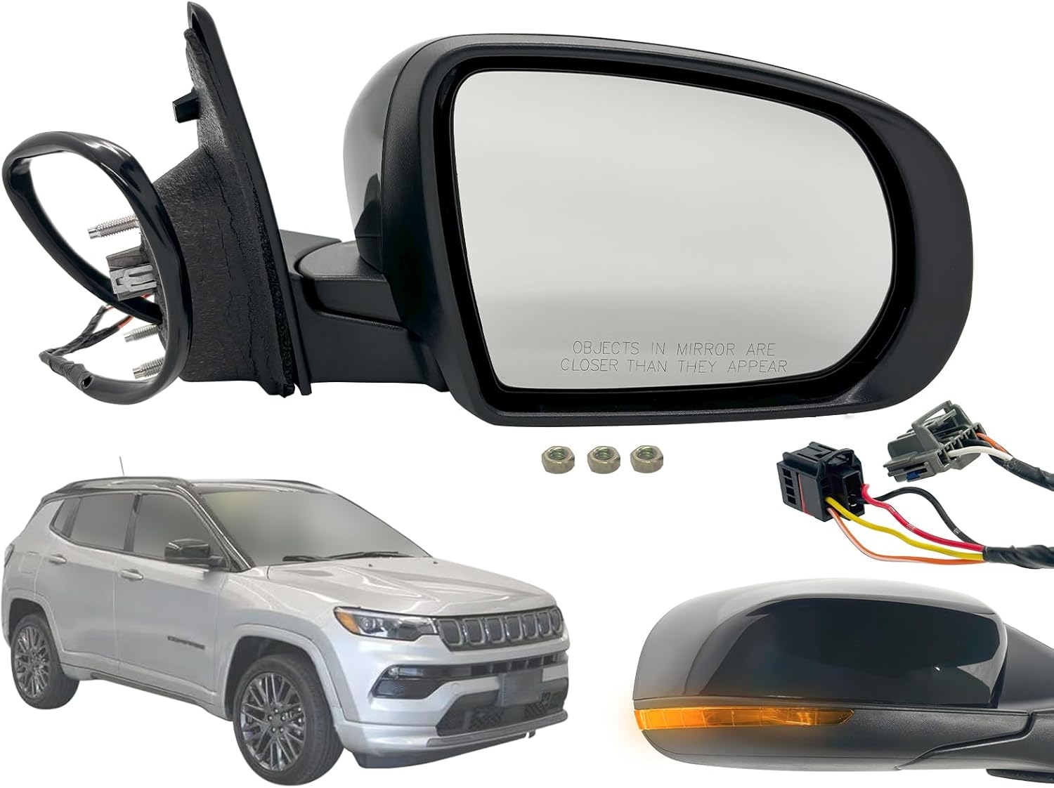 Item Description: Aftermarket Replacement of Exterior Rear View Mirror Assembly Driver Left LH Side Flat Glass Power Adjustment on Mirror Glass With Heated / Defrost / Defogger Function Smooth / Paint to Match / PTM / Ready to Paint / Paintable Black Cap Cover , Upper Part Textured Black Housing with Chrome Trim With LED Turn Signal Lamp Included in Housing , Amber Light With Blind Spot Detection / BSD / BSDS / BLIS Function Included in Glass , Amber Light No Puddle / Courtesy Lamp Included No Auto Dimmer / Auto-Dim / Auto Dimming Function Included No Memory Function Included No Side View Camera Included Manual Foldaway / Folding Type Standard Non-Towing Mirror Mounting Nuts Included Made in Taiwan Manufactured in ISO 14001 / IATF 16949 certified facilities Built to strict quality control standards We recommend that installation be done by professionals, as item will not come with installation instructions and we do not provide any installation/troubleshooting assistance. Disclaimer: This product is designed for use exclusively with vehicles that were originally manufactured with the corresponding factory-installed features. Compatibility is not guaranteed for vehicles that have been modified or do not include these features from the factory. Fits OEM Part Number: 68365147AA Fits Partslink Number: CH1320502 Fits Model and Year: 2017 2018 2019 2020 2021 17 18 19 20 21 COMPASS ( NEW STYLE )