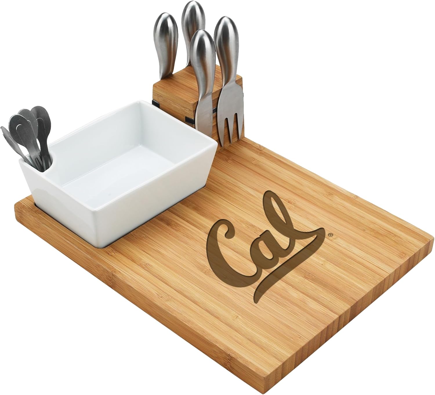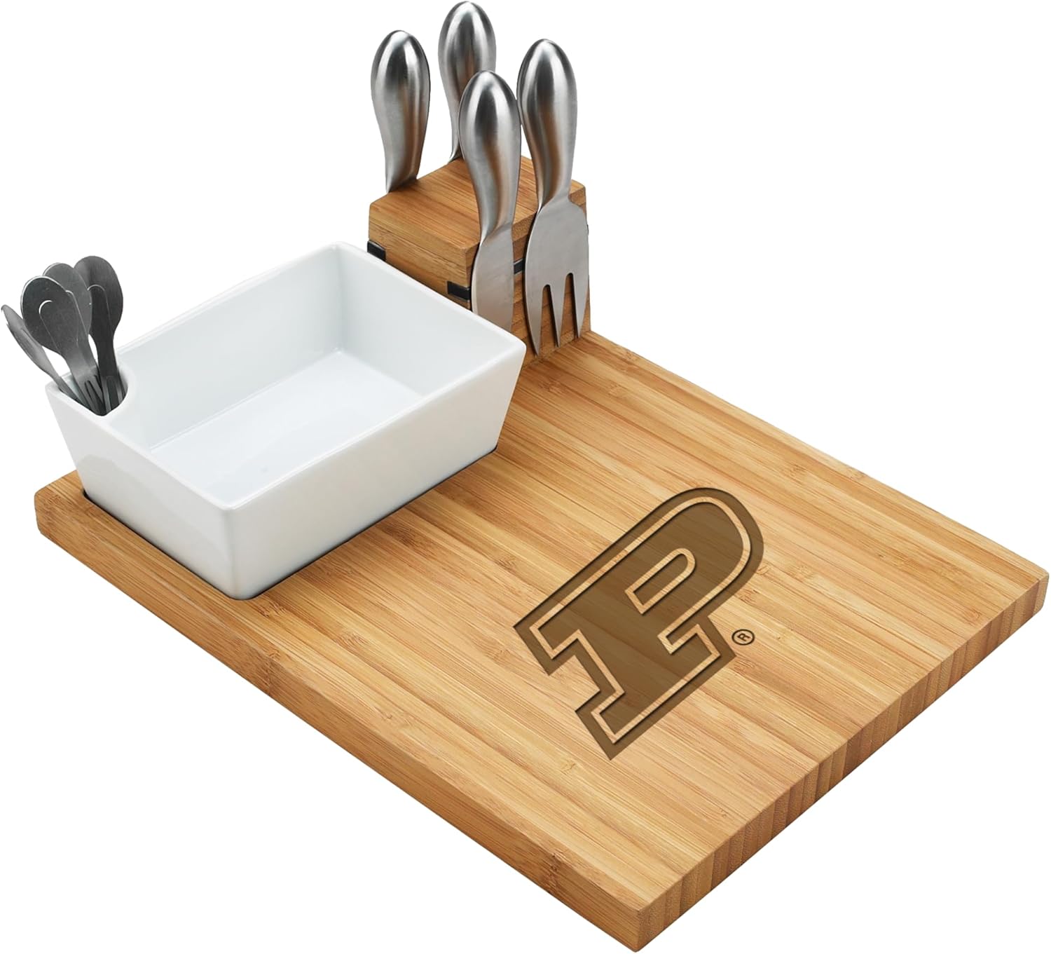 NCAA Penn State Nittany Lions Bamboo Cheese Board includes 2 Cheese knives, 1 cheese spreaders, 1 cheese fork.Ceramic dish with 4 stainless cocktail sticks for olives and appetizers. Product Type: -Cheese board & platter. Material: -Bamboo/Stainless steel/Ceramic. Overall Height - Top to Bottom: -3". Overall Width - Side to Side: -12". Overall Depth - Front to Back: -9". Overall Product Weight: -6.2 lbs.