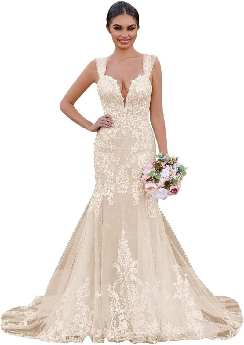 | Fabric Type | Long Tulle Spaghetti Straps V Neck Lace Appliques Mermaid Wedding Dress with Train |