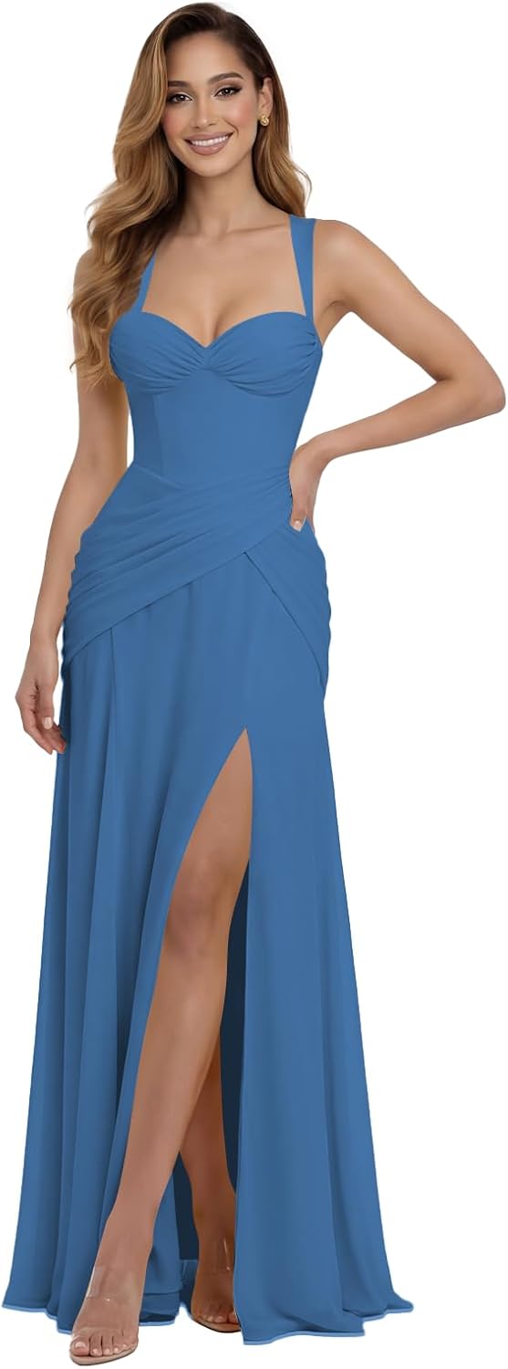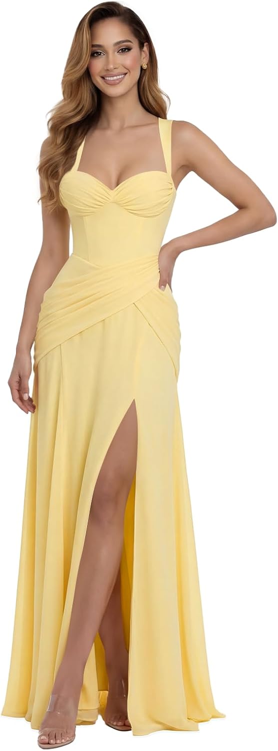 Welcome to HMONELY! As a specialized dress maker, we use only high-grade fabrics in every design, committed to bringing you superior dress products.Product Description:1.Fabric: Chiffon2.Neckline: Sweetheart3.Sleeves: Sleeveless4.Silhouette: Mermaid5.Length: Floor Length6.Features: Spaghetti Straps, with Slit, Mermaid, Pleated , Empire Waist7.Closure Type: Lace up BackIf you’re uncertain about your size, please measure yourself according to our detailed size chart for a perfect fit. Measurement details are as follows:1.Full Bust _ inch2.Waist _ inch3.Hips _ inch4.Hollow to Floor _ inch5.Height _ inchWe also provide additional customized services. Should you have any requirements, please consult our customer service first.Warm Tips:1. The actual color may vary slightly from the website images due to camera quality and monitor settings. All photos are taken in natural light without flash.2. Need this order urgently? Reach out to us first before ordering to guarantee on-time receipt.