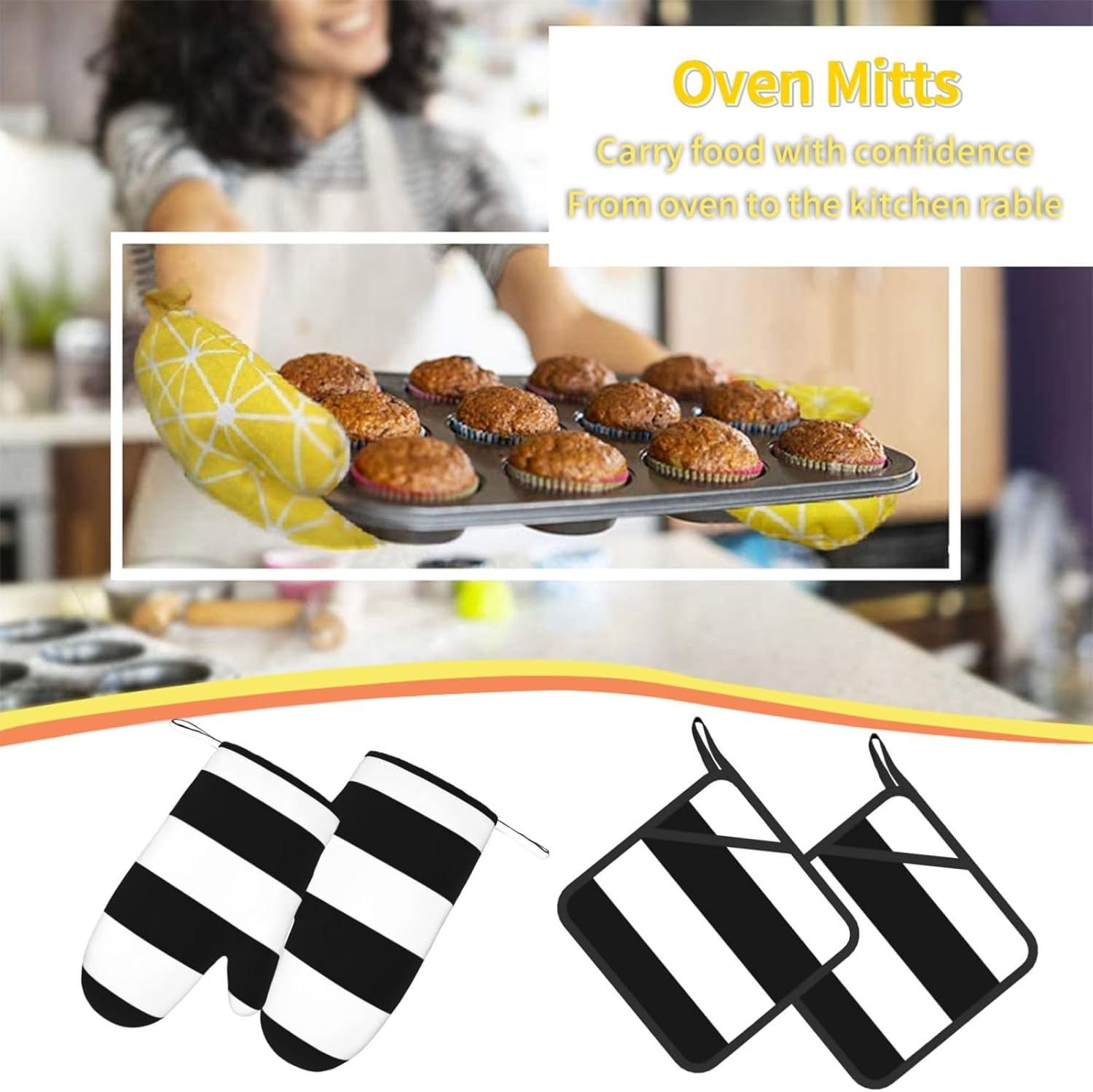 Upgrade your kitchen essentials with this oven mitts and pot holders set, designed for safe and comfortable handling of hot cookware. The set includes 2 heat-resistant oven mitts and 2 pot holders with pockets, making it a practical choice for daily cooking, baking, grilling, and microwave use.Crafted from high-quality polyester with thick insulated padding, these kitchen gloves deliver reliable heat protection up to 260°C. The soft quilted lining ensures comfort and flexibility, while the silicone palm design enhances grip and control when handling hot pots, pans, and trays.The non-slip silicone surface provides added stability, giving you confidence when moving hot cookware. Waterproof inner and outer layers make cleaning simple—just wipe clean or hand wash and air dry for easy care.Each piece features a convenient hanging loop for organized storage and quick access in your kitchen. Stylish and functional, this oven mitts set also makes a thoughtful gift for family and friends on holidays, housewarmings, and special occasions.
